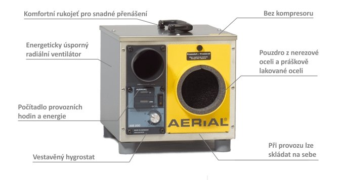 Profesionální adsorpční odvlhčovač vzduchu Aerial MASTER ASE 200 určený pro průmyslové použití je vhodný pro vysoušení velkých prostorů. Odvlhčuje již od -10°C.