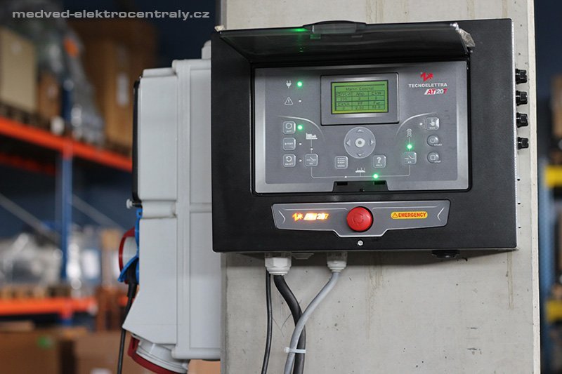 Záložní generátor s automatickým startem je napojen na rozvaděč stávajícího elektrického rozvodu a v případě výpadku sítě se sám nastartuje a přípojí. Přepínač elektrocentrála/rozvodná síť je zabudován uvnitř řídící jednotky AT207. Náhradní zdroje jsou vybaveny elektrickým startérem, který zajišťuje bezobslužné startování a pravidelné profylaktické starty prověřující připravenost systému.