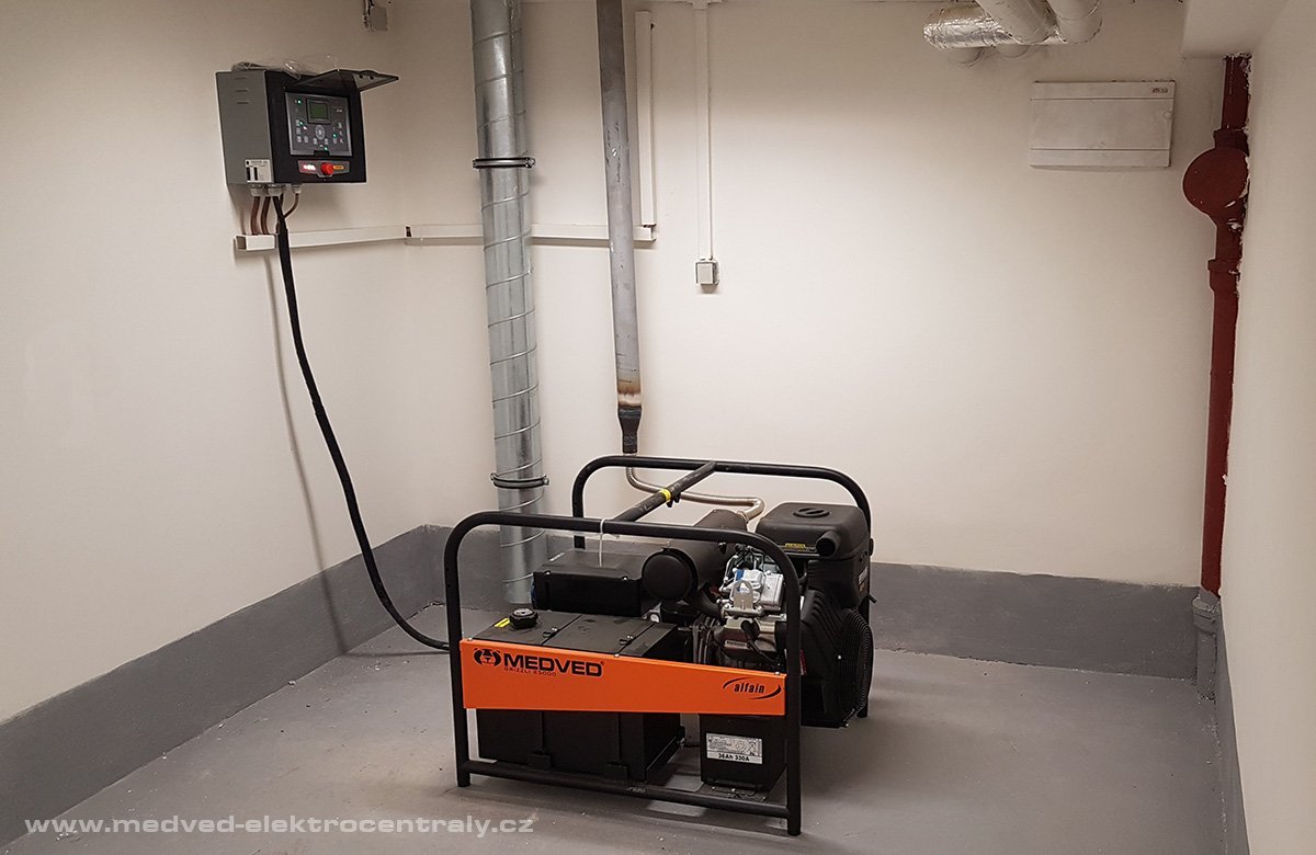 Záložní generátor s automatickým startem je napojen na rozvaděč stávajícího elektrického rozvodu a v případě výpadku sítě se sám nastartuje a přípojí. Přepínač elektrocentrála/rozvodná síť je zabudován uvnitř řídící jednotky AT207. Náhradní zdroje jsou vybaveny elektrickým startérem, který zajišťuje bezobslužné startování a pravidelné profylaktické starty prověřující připravenost systému.