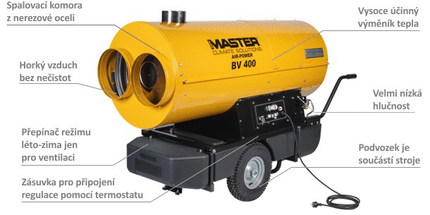 Naftové topidlo MASTER BV 400 s ventilátorem "plug fan" je vhodné pro vytápění velkých prostorů.