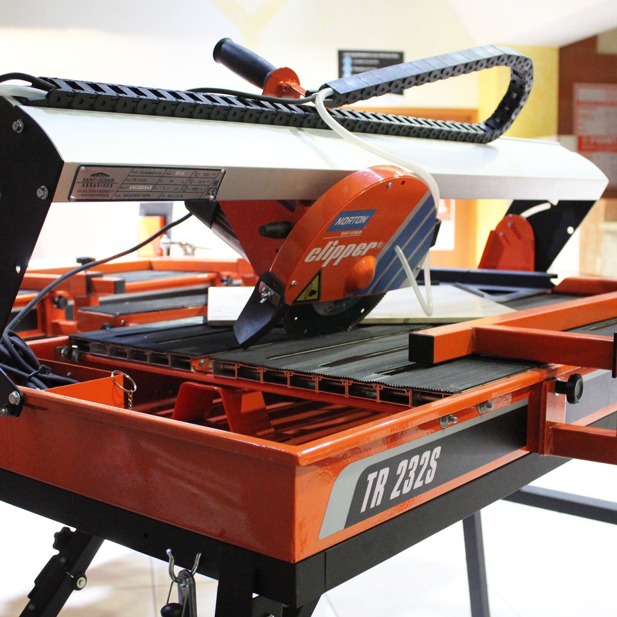 Obkladačská pila NORTON Clipper TR 232 L je profesionální stroj s výkonným motorem 1.100 W a délkou řezání přizpůsobenou pro velké formáty obkladů 1.200 mm.