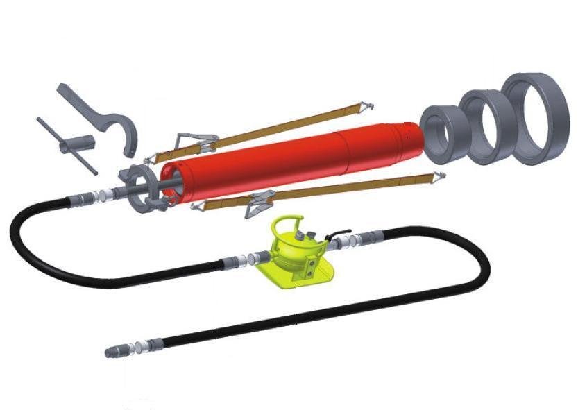 Sestava zahrnuje: raketa MAX T240, prstence pro aplikaci potrubí, vyztužená pneumatická hadice, přimazávač,