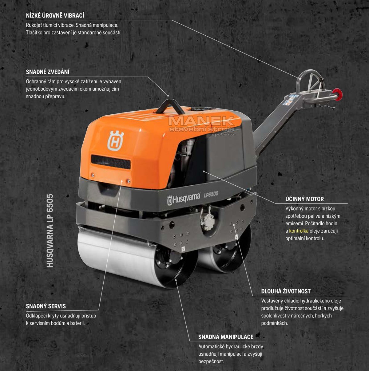 Řada ručně vedených tandemových válců – Husqvarna LP 6505 a LP 7505 – je ideální pro zhutňování mělkých vrstev na zrnitých zeminách a asfaltu. Díky vysoké odstředivé síle a otáčkám vykonají více práce za kratší dobu. Tandemové válce Husqvarna mají plně hydraulický pojezd i vibrace. Kompaktní konstrukce s velkou světlou výškou pro přejíždění obrubníků, nulovým přesahem a štíhlými boky umožňuje jezdit kolem stěn, sloupků nebo okrajů – prakticky všude, kam vás práce zavede. Kontrukce válce umožňuje také jeho otočení na velmi malém prostoru.Zapínání a vypínání vibrací je na obou tandemových válcích jednoduché a díky provedení antivibrační rukojeti můžete pracovat i několik hodin.
