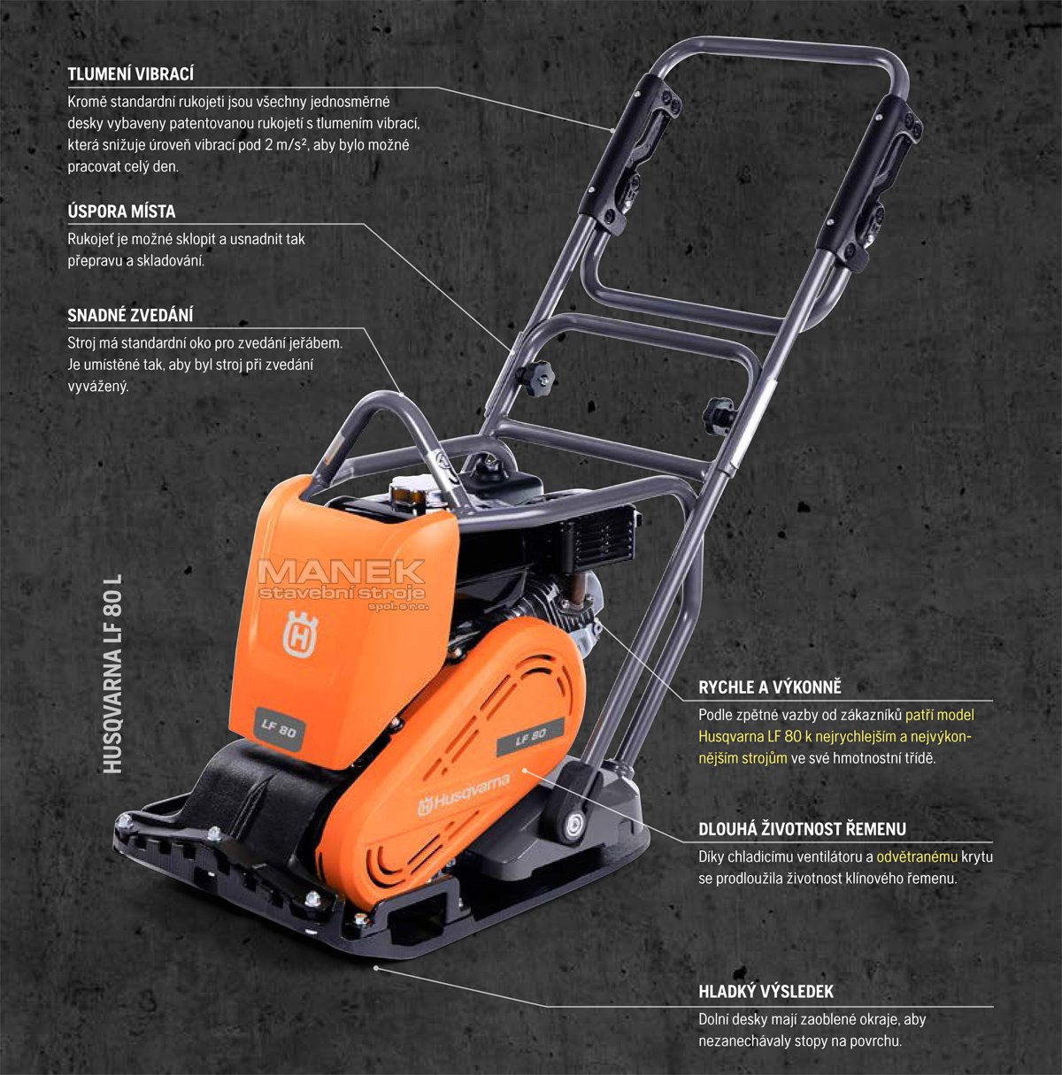 Vibrační deska Husqvarna LF 100 L je vhodná pro opravy a údržby středního rozsahu. Deska je vhodná pro použití na sypké spodní vrstvy - písky a štěrky, zámkovou dlažbu i pro použití na asfalt. Byla navržena pro zhutňování mělkých až středně hlubokých vrstev, které vyžadují dobrou trakci, vysokou odstředivou sílu a vyšší frekvenci.
