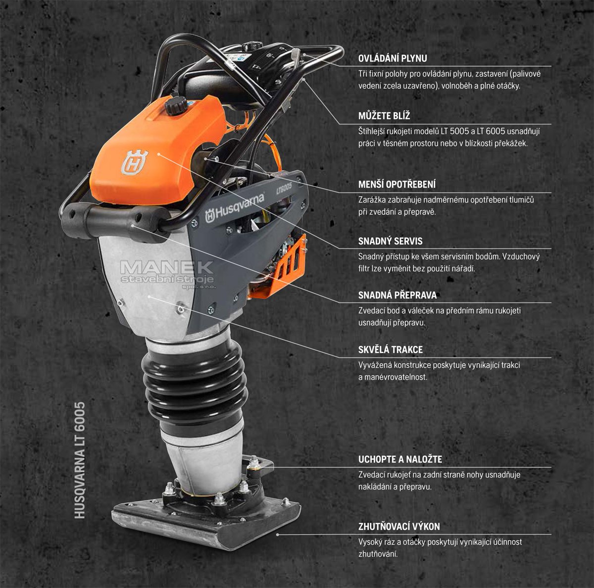 Vibrační pěch Husqvarna LT 6005i je spolehlivý a výkonný stroj pro hutnění silnějších vrstev štěrku, zemin a jiných zásypových hmot. Používá se pro hutnění jak ve výkopech, tak v otevřeném prostoru. Je vybaven výkonným motorem HONDA GXR 120. Vibrační pěch má výrazně odpruženou rukojeť a díky dobrému vyvážení má rovnoměrnou trakci a efektivní schopnost zhutnění. Rolna a rukojeť umožňuje snadné nakládání a přepravu.
