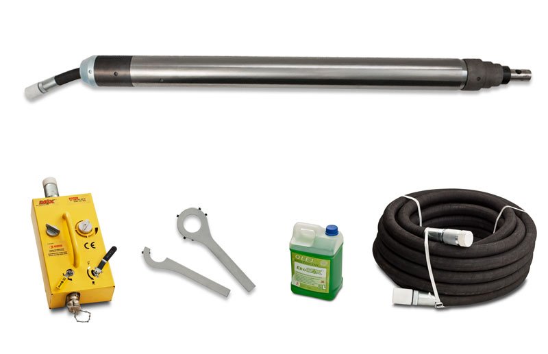 Sestava zahrnuje: zemní raketu, vyztuženou pneumatickou hadici 20 m, olejovač, sadu nářadí, olej EkoMAX 5 l, konzervační olej 1 l