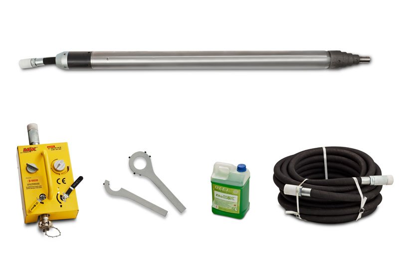Sestava zahrnuje: zemní raketu, vyztuženou pneumatickou hadici 20 m, olejovač, sadu nářadí, olej EkoMAX 5 l, konzervační olej 1 l